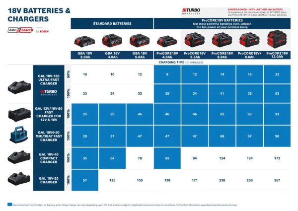 The GAL 12V/18V-80 Professional is compatible with the Bosch Professional 18 V and 12 V systems. It is also compatible with the AMPShare multi-brand battery alliance.
