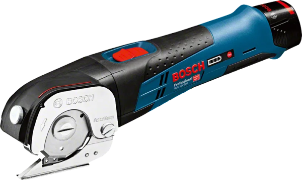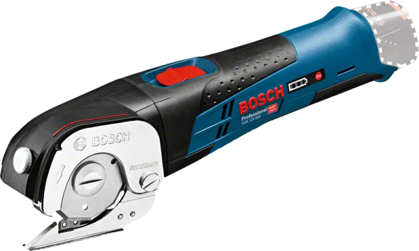 This tool is designed for cutting PVC, carpet, cardboard, leather, and fabrics. It is compatible with all 12 V Bosch Professional batteries and chargers (Professional 12V System).